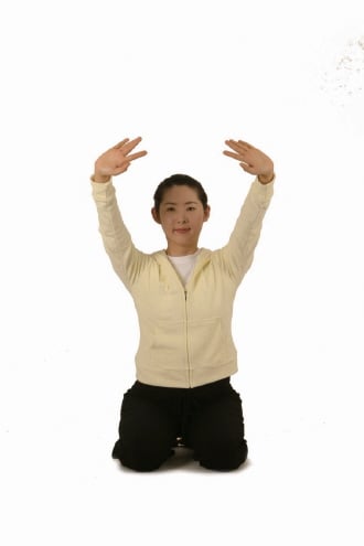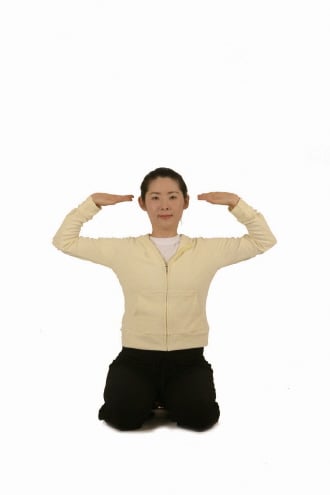 가슴을 앞으로 내밀면서 손을 70-80도 정도 배구공을 토스하듯이 위를 향해 양팔을 힘차게 뻗으며 숨을 내쉰다(사진 4). 손목이 꺾여 있고 뻗어진 팔이 완전히 펴지지 않게 한다.