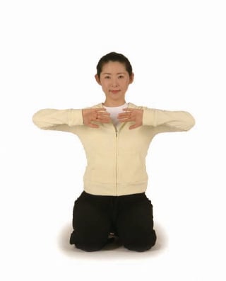 손목을 꺾어 양손 끝을 가슴에 댄다.(사진2)