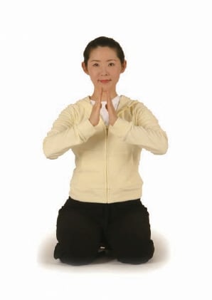 ▲숨을 내쉬면서 얼굴 쪽을 감싸고 있던 손바닥을 내리면서 서서히 서로 마주 보게 한 후 손바닥을 마주보게 한 채로 아래로 내린다(사진 2).