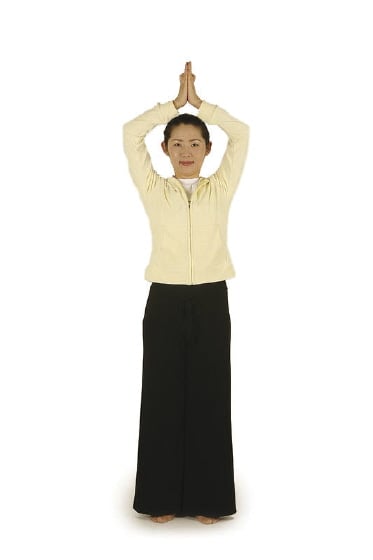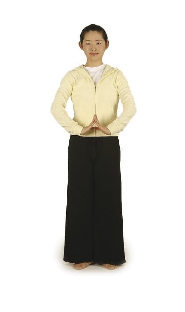 ▲서 있는 기본 자세(차렷 자세)에서 손을 쫙 펴서 손끝만을 맞대어 삼각형 모양을 만든다(사진 1). 이때부터 얼숨을 들이 쉰다.