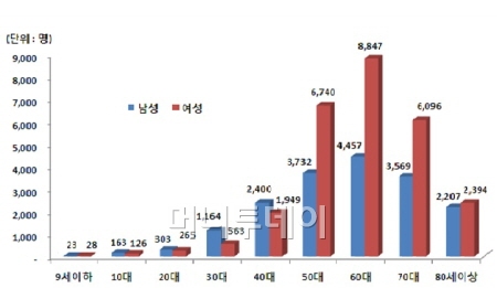 인구 10만명당 고지혈증 환자를 성별과 연령에 따라 조사한 결과에 따르면 여성의 경우 60대(8847명), 50대(6740명), 70대(6096명) 환자가 압도적으로 많았다. 남성은 60대(4457명), 50대(3732명), 70대(3569명)에서 환자가 많았지만 나이에 따른 편차는 여성보다 크지 않았다.