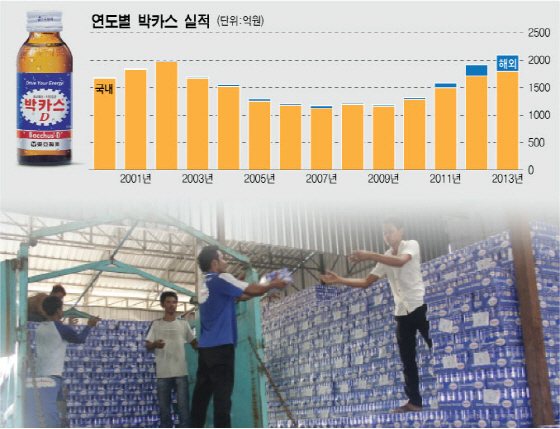 2010년부터는 박카스가 해외에서 승승장구했다. 2010년 42억이었던 해외 매출은 2011년 87억원, 2012년 208억원으로 급성장했다. 지난해 박카스의 해외매출은 305억원으로 전년보다 47% 늘었다. 박카스는 동아제약그룹의 계열사동아에스티(45,750원 ▼450 -0.97%)가 수출하는 박카스는 캔 형태로 미국과 중국, 일본, 캄보디아 등 18개국으로 뿌려지고 있다.