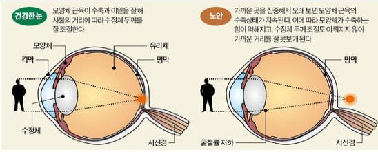 노안이란 눈 속 수정체가 딱딱해지고 탄력이 둔화돼 원근조절력이 떨어지면서 가까운 글씨를 읽기 어려워지는 현상으로 40대 초반 시작해서 연령이 증가할수록 점점 더 심해진다.