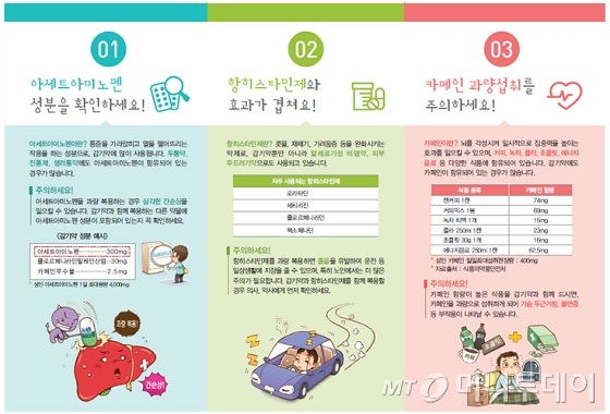 대표적인 것이 아세트아미노펜 성분이 든 진통제와 항히스타민제다. 아세트아미노펜은 통증을 가라앉히고 열을 떨어뜨리는 작용을 하는 의약품 성분이다. 감기약 뿐 아니라 두통약, 진통제 등에도 포함돼 있다.