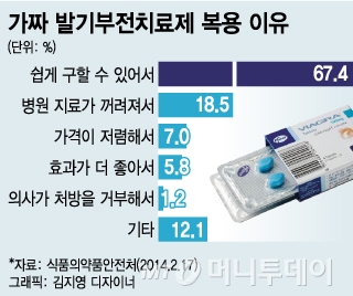 구하기 쉬운데다 병원에 가서 발기부전 처방받기를 꺼려하기 때문이다. 식품의약품안전처가 가짜 발기부전치료제 복용층을 대상으로 설문조사한 결과 67.4%가 '쉽게 구할 수 있어서'라고 답했다. 18.5%는 '병원 진료가 꺼려져서'였다.··
