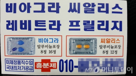 굳이 남대문시장을 찾지 않더라도 가짜약을 구하기는 어렵지 않다. 공공장소 남자 화장실 몇 곳만 돌아도 '비아그라·씨알리스 판매' 명함이 널려 있다. 유흥업소에서도 고객 관리 차원에서 가짜약을 나눠준다.
