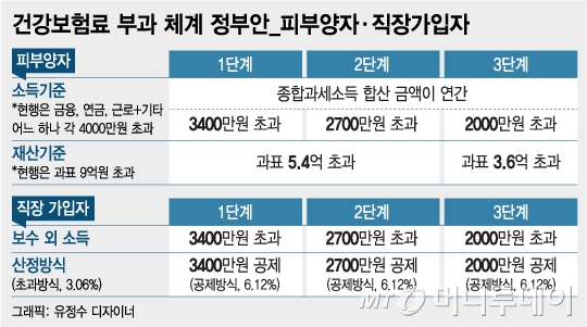 ◇소득 3400만원 초과시 피부양자 탈락= 과표 기준 5억4000만원짜리 아파트와 3400만원 초과 소득이 있으면 피부양자 자격을 잃는다. 현재는 금융소득이나 공적연금, 근로와 기타 소득 중 하나라도 연간 4000만원 이하면 피부양자 자격이 된다. 과표 기준 재산이 9억원 이하면 상관없던 조건도 5억4000만원으로 강화됐다. 단, 연소득이 1000만원 이하일 때는 예외다. 3단계에 이르러서는 소득 기준이 2000만원 초과, 재산은 3억6000만원으로 문턱이 높아진다.