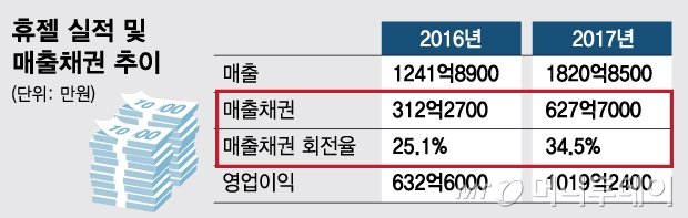 업계는 휴젤의 부실채권 파장이 이어질지 여부를 관심있게 지켜보고 있다. 지난해 갑자기 눈덩이처럼 커진 매출채권이 앞으로도 부담으로 작용할 수 있어서다. 2016년까지만 해도 312억원이던 휴젤 매출채권은 지난해 말 628억원으로 2배가 늘었다. 같은 기간 매출액은 1242억원에서 1821억원으로 증가했다. 매출에서 외상거래 의존도를 보여주는 매출채권회전율은 2016년 25.1%에서 1년새 34.5%로 뛰었다. 이는 경쟁업체 메디톡스가 최근 2년간 매출채권회전율을 21.2~23.2% 수준으로 유지해온 것과 대조적이다.