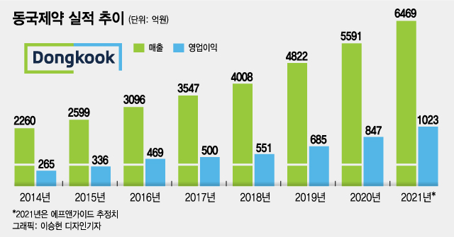 이 같은 다각화는 감염병이 전 세계를 휩쓴 지난해 특히 빛을 냈다. 동국제약의 지난해 매출은 5591억원. 감염병 국면에도 전년보다 15.9% 늘어난 결과이자 회사 첫 매출 5000억원 돌파였다. 영업이익도 21.9% 늘었다.