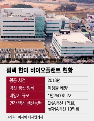 이와 관련 그룹의 원료의약품 계열사인 한미정밀화학은 1년 내에 최대 3억회 분량의 mRNA백신 원료를 공급할 수 있는 능력을 갖춘 상태다. 원료를 이용해 mRNA 백신 자체를 생산할 능력은 원료 생산능력을 뛰어넘는다. 평택 한미 바이오플랜트는 연간 DNA 백신은 1억회, mRNA 백신은 10억회 물량을 생산할 수 있다.
