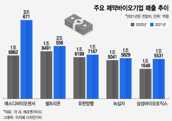 국내 제약·바이오업계가 오랜기간 대형업체의 척도로 삼아온 연 매출 '1조클럽' 그 이상을 바라본다. 지난해 1위였던 셀트리온이 연 매출 2조원 돌파가 전망되는 가운데 코로나19(COVID-19) 진단키트로 폭발적 성장에 성공한 에스디바이오센서는 업계 초유의 3조원대 매출 전망과 함께 순위 변동을 예고하고 있다.