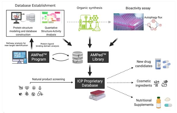 이러한 연구 개발 과정을 통해 확보한 'AMPed(Autophagy Modulating Peptide derivatives)' 기술은 새로운 펩타이드 소재를 디자인, 합성하고 효과를 평가하는 플랫폼으로, AMPed 기술을 통해 약 1000여 종의 펩타이드 물질을 개발·보유하고 있다.