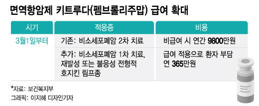 키트루다는 임상 시험에서 첫 치료부터 사용해도 기존 항암제 대비 효과가 뛰어나다는 결과를 얻었다. 문제는 지금까지 국내에서는 세포 독성 항암제 1차 치료 후 실패한 환자에게만 2차 치료로서 키트루다 급여가 적용됐다는 것이다.