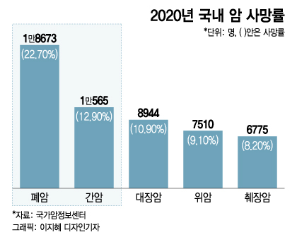 국가암정보센터에 따르면 2020년 기준, 국내 암 사망률 1위와 2위는 각각 폐암과 간암이다. 2020년 폐암 사망자 수는 1만8673명으로 전체 암 사망자의 22.7%에 달한다. 간암 사망자는 1만565명으로 12.9%를 차지했다.