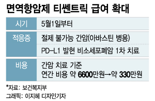 유일한 간암 치료 면역항암제임에도 티쎈트릭·아바스틴 병용요법은 높은 치료 비용 때문에 처방이 쉽지 않았다. 비급여 시 연간 치료 비용은 약 6600만원이었다. 이달부터는 건강보험 급여 확대로 산정특례가 적용되면서 환자는 약값의 5%만 부담하면 된다. 약 330만원이다.