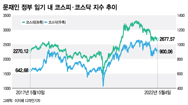 문 대통령 취임 후 5년(2017년 5월10일~2022년 5월4일) 동안 코스피지수는 2677.57(4일 종가 기준)로 17.9% 올랐다. 코스닥지수는 642.68에서 900.06로 40% 상승했다. 같은 기간 시가총액은 1476조2209억원에서 2107조5501억원으로 42.8% 커졌다.