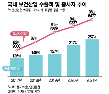 문 대통령 재임 기간 제약·바이오 산업은 수출과 고용 지표 측면에서 두드러진 성장세를 보였다. 한국보건산업진흥원에 따르면 지난 2017년 126억달러(약 15조9600억원)이었던 국내 보건산업(의약품, 의료기기, 화장품) 수출액은 149억달러(18조8700억원)→157억달러(19조8850억원)→217억달러(27조4800억원)→257억달러(32조5500억원)로 증가했다. 2020년 처음으로 10조원을 넘어선 기술수출액도 지난해 13조원으로 규모를 키웠다.