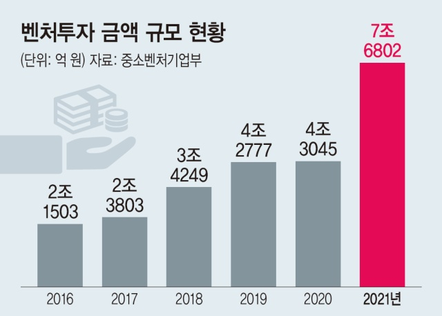 실제로 지난해 연간 신규 벤처투자액은 7조원을 돌파하며 역대 최대 규모를 기록했다. 직전 최대 실적이었던 2020년 4조3045억원에서 78.4% 증가한 규모이며, 2017년 2조3803억원과 비교하면 3배 이상 늘었다.