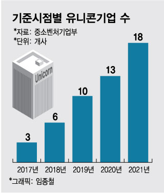 문재인정부 출범 당시 단 3개에 불과했던 유니콘(기업가치 1조원 이상 비상장기업)의 수는 지난해 말 기준 18개로 6배 증가했다. 기업가치 1000억원 이상의 예비유니콘이 357개에 달할 정도로 혁신 기업층이 두터워졌다.