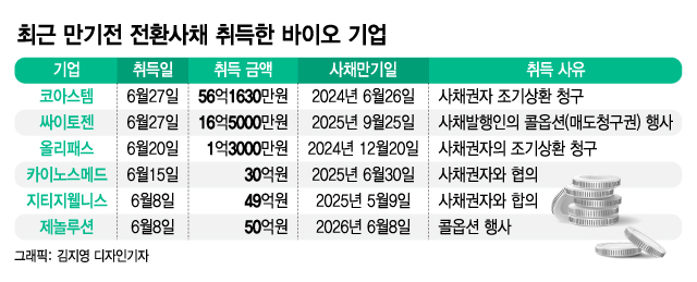 28일 관련업계에 따르면 이달 카이노스메드(1,087원 0%), 지티지웰니스(865원 ▲64 +7.99%), 올리패스, 코아스템(3,200원 ▼50 -1.54%) 등 바이오 기업이 만기 전 전환사채를 취득했다. 쉽게 말해 CB투자자가 투자금을 주식으로 전환하지 않고 현금으로 돌려 받은 것이다.