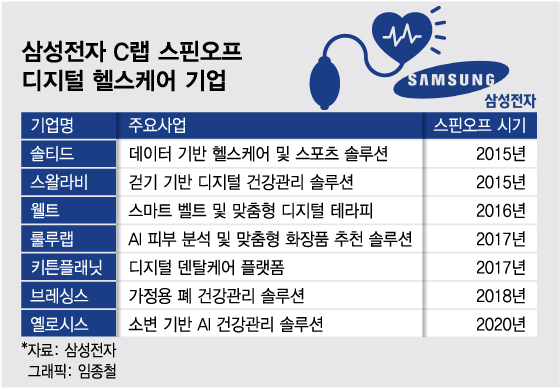 1일 삼성전자에 따르면 C랩 인사이드를 통해 최근까지 스핀오프에 성공한 디지털 헬스케어 기업은 △룰루랩 △솔티드 스왈라비 △웰트 △키튼플래닛 △브레싱스 △옐로시스 등이다. 피부데이터에서부터 폐 건강, 구강 관리, 맞춤형 디지털 테라피, 소변 기반 건강관리 솔루션 등 사업 영역도 다양하다.
