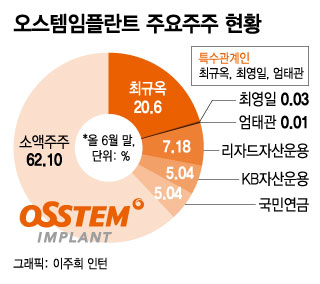 오스템임플란트의 최대주주는 최규옥 회장으로 올해 상반기 말 기준 특수관계인을 포함한 지분율은 20.64%다. 업계에선 확실한 우호 지분까지 포함한 최 회장 측의 사실상 지분율을 28% 정도로 추정하고 있다. 이외 5% 이상 주주는 라자드에셋매니지먼트(7.18%), KB자산운용(5.04%), 국민연금공단(5.04%)이다. 소액주주 지분율은 62.2%다.