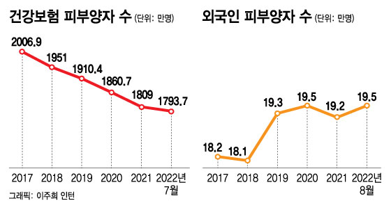 반면, 외국인 피부양자 수는 지난 5년간 소폭 증가했다. 2017년 18만2000명에서 2021년 19만2000명으로 늘었다. 지난 8월 기준으로는 19만5000명으로 집계됐다.