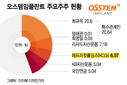 강 대표 측은 지난해 12월 21일 5% 이상 지분 공시를 통해 오스템임플란트 지분 대량 매입을 공개 선언했다. 강 대표 측 유한회사인 에프리컷홀딩스는 당시 오스템임플란트 지분 5.58%(83만511주)를 보유했다고 공시했다. 에프리컷홀딩스는 강성부 대표가 최대출자자인 케이씨지아이한국지배구조개선사모투자 합자회사(최대주주 KCGI)가 100% 출자한 유한회사다.