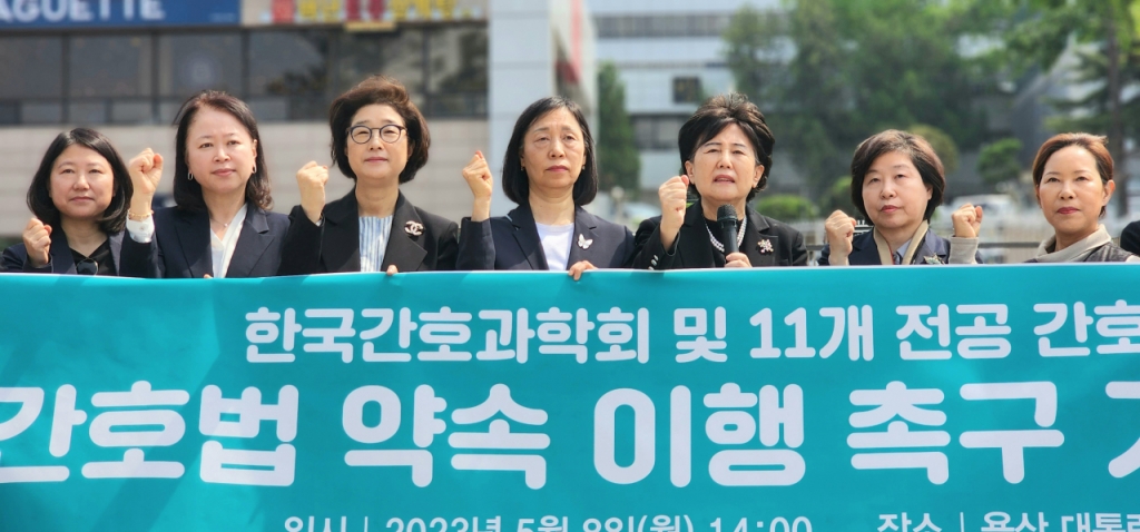 4100여 명의 간호대학 교수들로 구성된 한국간호과학회와 11개 전공 간호학회, 한국간호행정학회, 한국기본간호학회, 한국기초간호학회, 한국성인간호학회, 한국아동간호학회, 한국여성건강간호학회, 한국정신간호학회, 한국지역사회간호학회, 대한종양간호학회, 한국간호교육학회, 한국노인간호학회의 회장들은 이날 대통령실 앞 길거리에서 기자회견을 열고 "지난달 27일 국회 본회의에서 간호법이 통과된 것에 대해 적극적으로 환영하며, 간호법 공포를 촉구한다"고 밝혔다.
