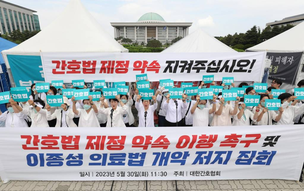 ![[서울=뉴시스] 김금보 기자 = 대한간호협회 회원들이 간호법 제정안 재표결일인 30일 서울 영등포구 국회의사당 정문 앞에서 '간호법 제정 약속 이행 촉구 및 이종성 의료법 개악 저지 집회'를 열고 구호를 외치고 있다. 2023.05.30.](https://thumb.mt.co.kr/cdn-cgi/image/f=avif/21/2023/05/2023053013300928680_1.jpg)