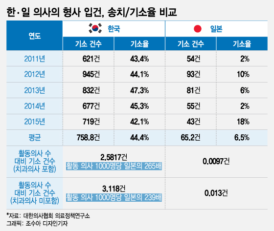 우리나라 의사가 사법기관에 기소되는 건수와 비율은 여타 해외 국가보다 확연히 높았다. 2019년 기준 과실치사상죄로 검찰에 입건·송치된 의사 수는 한국이 783명이었다. 반면 일본은 33명에 불과했다. 2011~2015년 기준 활동 의사 1000명당 기소 건수는 우리나라가 2.5817건, 일본이 0.0097건이다. 한국이 일본보다 265배 높다. 미국과 영국, 독일 등과 비교해도 우리나라 의사의 기소, 입건송치율이 더 높았다.