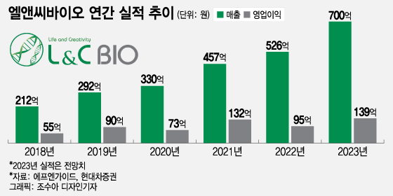 다만 2021년 첫 100억원을 돌파(132억원)한 영업이익은 지난해 95억원으로 주저앉았다. 임상시험수탁기관(CRO) 자회사인 글로벌의학연구센터의 상대적 부진과 신규 사업 진출을 위한 인력 채용 등의 비용 반영이 영향을 끼쳤다. 1분기 말 기준 엘앤씨바이오 직원 수는 121명으로 전년 동기 99명 대비 20%가량 늘어난 상태다. 이에 2021년 28.8%였던 영업이익률은 지난해 18% 수준까지 낮아졌다.