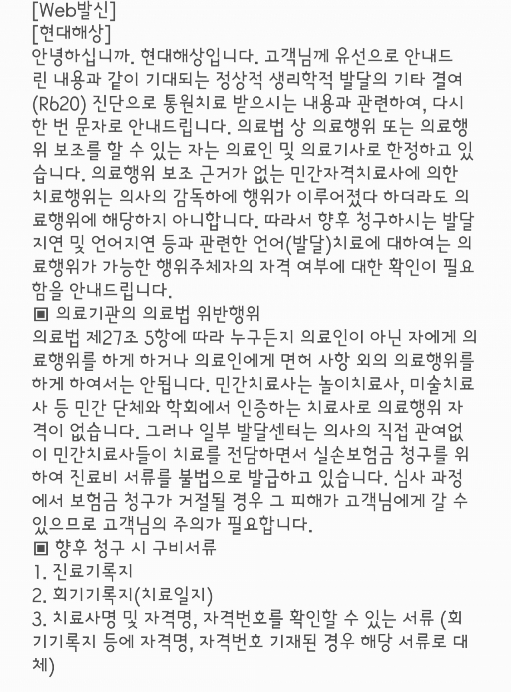 이들 단체는 현대해상에서 이런 내용의 알림톡을 다시 배포하면 위법행위와 장애인에 대한 인권침해에 대해 국가인권위원회를 비롯한 유관 기관에 제소하는 등 법적조치를 취할 것이라고도 거듭 선언했다. 이 학회 강은식 인증평가이사는 "현대해상 등 실손의료보험 회사의 보호자 등에 대한 협조 요청은 일부 발달센터의 불법행위로부터 피해방지를 위한 목적으로 이해할 수도 있겠지만 적법하게 훈련된 전문가들, 합법적으로 운영되는 의료기관에 대한 불신을 조장하는 부작용이 생길 수 있다"고 경고했다.