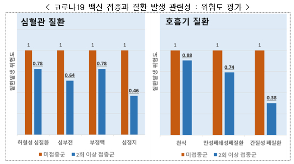비교 결과, 2회 이상 백신접종자는 미접종자 대비 코로나19 감염 이후 심혈관질환(허혈성심질환, 심부전, 부정맥, 심정지), 혈전 관련 질환(폐색전증, 정맥혈전증), 신장질환(급성신부전, 혈액투석), 호흡기 질환(만성폐쇄성폐질환, 간질성폐질환), 간경화, 당뇨병 등의 질환 발생위험이 유의하게 감소했다.