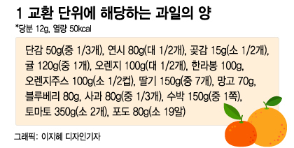 혈당이 높은 당뇨병 환자는 당도가 높은 과일을 먹을 때면 고민이 깊어진다. 실제 과일은 비타민과 무기질이 풍부하게 함유돼 있지만 채소보다 당분 함량이나 열량이 높아 무턱대고 먹다간 건강에 악영향을 미칠 수 있다. 특히, 과일에 함유된 당분은 단순당으로 혈당을 급격히 상승시키므로 식후 바로 섭취하거나 활동량이 적은 밤에 섭취하는 것보다 오전이나 오후 간식으로 한 번에 소량씩(1 교환 단위) 섭취하는 것이 바람직하다. 1 교환 단위는 식품을 바꿔 먹어도 섭취하는 영양소의 양과 열량이 같다는 '기준'으로 계절에 따라 과일도 맞춤 선택하면 된다. 과일주스는 소화 흡수가 빨라 혈당을 빠르게 올리는 만큼 가능한 생과일을 먹는 게 좋다. 과일주스를 먹을 때는 영양성분표를 확인해 당분이 적은 제품을 선택하고 무가당 주스나 천연과즙 제품을 선택한다.