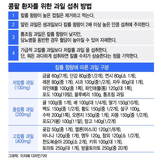 체내 미량 영양소인 칼륨은 혈관 벽을 이완시켜 넓히는 작용을 한다. 심장 박동을 고르게 유지하는 한편 근육과 신경의 흥분을 가라앉히는 데도 도움 된다. 혈압 상승이 억제되고 비타민 등의 각종 항산화 물질의 작용으로 심혈관질환을 예방하는 데도 효과적이다. 하지만, 콩팥(신장) 기능이 떨어진 환자는 상황이 달라진다. 칼륨은 소변으로 배출되는데, 콩팥 기능이 줄면 칼륨이 제대를 내보내지 못하고 몸에 쌓여 근육이 쇠약해지고 부정맥, 심장마비 등 치명적인 결과를 낳을 수 있다. 혈액 검사에서 칼륨 수치가 상승했거나 소변량이 줄었다면 특히 고칼륨 과일 섭취에 주의해야 한다.