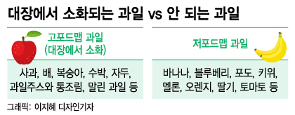 과일을 먹으면 설사, 변비가 심하거나 가스가 과도하게 차는 등 하부 위장관 증상을 경험하는 사람도 있다. 과일의 과당은 포드맵(FODMAP, 발효당(Fermentable), 올리고당(Oligosaccharides), 이당류(Disaccharides), 단당류(Monosaccharides), 그리고(And) 당알코올(Polypols)의 앞 글자를 따서 만든 단어)으로 분류된다. 포드맵은 소장에서 잘 흡수되지 않고 대장에서 미생물들에 의해 발효돼 많은 양의 가스를 만들거나 복통, 복부 팽만감, 설사의 원인으로 작용할 수 있다. 따라서 과민성대장증후군 환자나 장이 예민하고 탈이 잘 난다면 '고포드맵 과일'은 피하는 것이 좋다. 되도록 씨와 껍질을 제거하고 과육 위주로 먹는 것도 추천된다.
