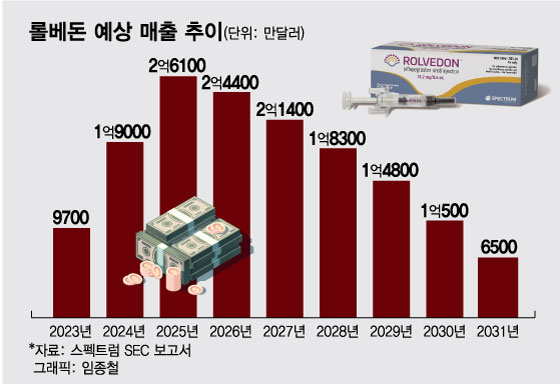 보고서에는 스펙트럼이 자체적으로 추산한 롤베돈 매출 전망도 공개됐다. 지난해 10월 미국에서 출시된 롤베돈은 지난해 10~12월 111만달러의 매출을 올렸다. 스펙트럼은 롤베돈이 올해 9700만달러의 매출을 낼 것으로 예상했다. 매출이 정점을 찍는 시점은 2년 뒤인 2025년으로 2억6100만달러의 매출을 올릴 것으로 추정했다. 이후 2026년 2억4400만달러, 2027년 2억1400만달러, 2028년 1억8300만달러 등 매년 매출이 줄어들다가 2031년 6500만달러로 내려갈 것이라는게 스펙트럼 전망이다. 이 기간 발생할 롤베돈 매출 총액은 15억800만달러, 우리돈으로 약 2조원이다.