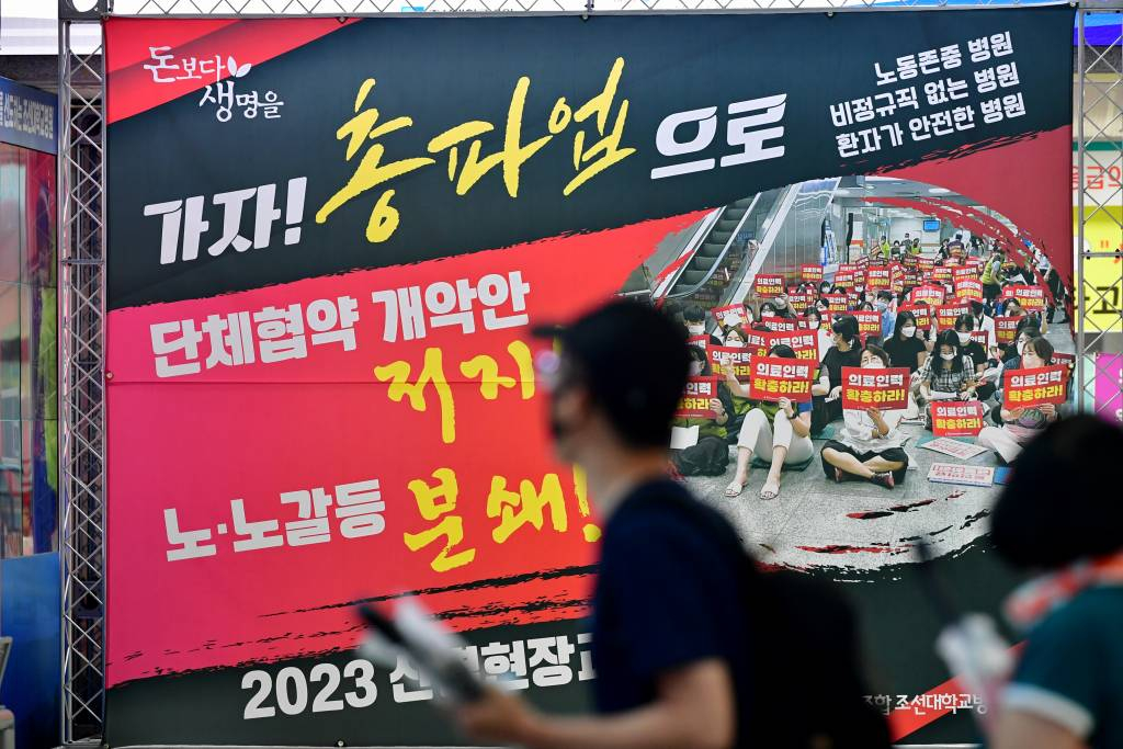 ![[광주=뉴시스] 이영주 기자 = 전국보건의료산업노조 총파업 이틀을 맞은 14일 오후 광주 동구 조선대병원 접수처 앞에서 시민들이 접수를 기다리고 있다. 2023.07.14.](https://thumb.mt.co.kr/cdn-cgi/image/f=avif/21/2023/07/2023071414042969571_1.jpg)