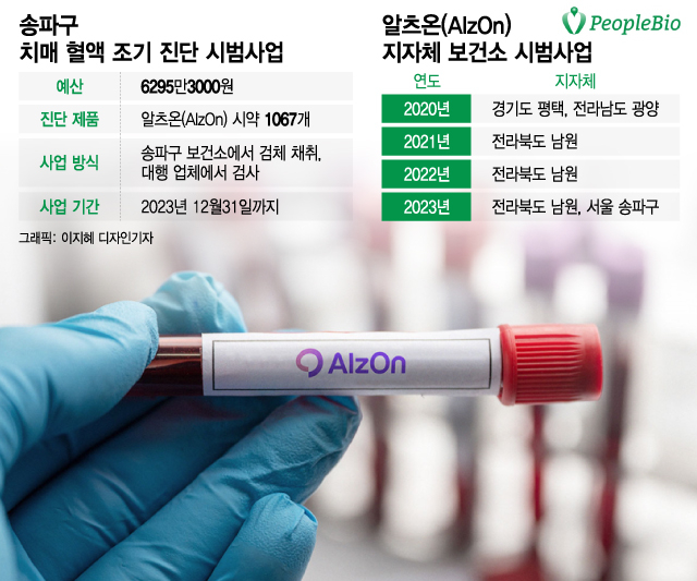 송파구 보건소 관계자는 "치매 선별 검사에서 정상으로 나왔는데도 인지 저하를 호소하는 분들이 많아 어떡할까 고민하다가 '전 세계 최초 혈액 조기 진단'이라는 게 있다고 들어서 알츠온을 이용한 사업을 시도하게 됐다"고 설명했다. 이어 "올해는 일단 시범사업으로 진행해보고 내년에도 할지는 앞으로 결정할 예정이다"고 말했다.