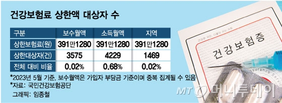 지난 5월 기준 상한액인 월 391만1280원의 건보료를 낸 사람은 6000~9000명 정도로 추산된다. 직장가입자의 월급여를 기준으로 하는 보수월액 기준 상한액 납입 건수는 전체 직장가입 납입건수 1978만6000건(복수 직장 시 중복 집계)의 0.02%인 3575건이다. 직장가입자 중 추가 소득(이자·배당·임대소득 등 종합과세소득)이 연 2000만원을 초과하는 직장가입자 61만9000명 중 연소득이 6억8199만원 이상으로 소득월액 건보료를 상한액만큼 내는 사람은 4229명이다. 연 2000만원을 초과하는 추가 소득이 있는 직장가입자는 보수월액과 소득월액을 모두 건보료로 납부해야 한다. 또 지역가입자 중 상한액을 내는 경우는 전체 919만8000건 중 0.02%인 1469건이다. 이를 모두 합하면 9243건으로 최대 9243명이 상한액만큼의 건보료를 낸 것이다. 여러 개의 직장에 다니거나 급여 외 2000만원 초과 소득이 있을 경우 중복 집계가 가능한 보수월액 납입건수를 제외하면 최소 5768명이 상한액만큼의 건보료를 낸 것으로 분석된다.