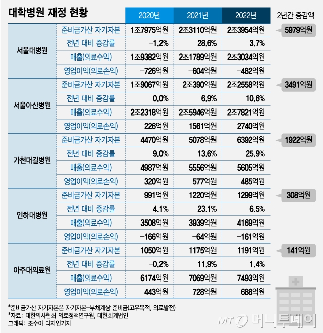 서울대병원의 경우 자기자본과 부채계상 준비금을 합한 준비금 가산 자기자본이 2020년 1조7975억원에서 지난해 2조3954억원으로 5979억원 불어났다. 같은 기간 서울아산병원은 1조9067억원에서 2조2558억원으로 3491억원 증가했다. 가천대병원 1922억원, 인하대병원은 30억원, 아주대의료원은 141억원 늘었다. 2년간 준비금가산 자기자본이 모두 두 자릿수 비율로 늘어났다.