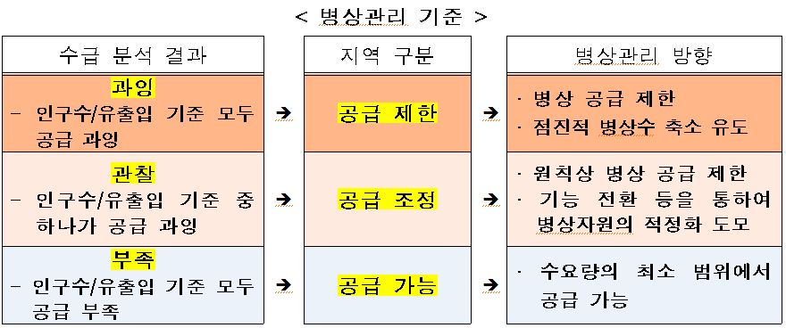 시·도는 병상관리 기준을 바탕으로 지역별 의료 이용, 의료 생활권 등 지역 상황을 고려해 병상수급과 관리계획을 오는 10월 말까지 수립할 예정이다. 시·도에서는 기본시책에 부합하도록 관리계획을 수립하되 필수의료 기능, 감염병 대응, 권역 책임의료기관 중심 네트워크 구축 등 예외 사항을 감안해 관리계획을 수립할 수 있다. 이에 과잉 공급지역이라 해도 병상 증설이 가능하다.