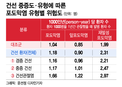 그랬더니 건선 환자에서 포도막염의 발병 위험도는 그렇지 않은 경우보다 유의미하게 증가했다. 그중에서도 건선 중증도가 높을수록 포도막염, 앞포도막염, 재발성 포도막염 등의 위험성이 전반적으로 증가한다는 사실이 확인됐다.