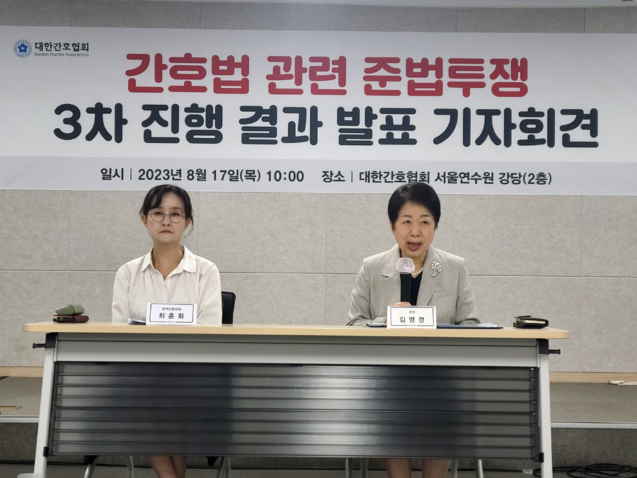 간협은 17일 '간호법 관련 준법투쟁 3차 진행 결과 발표' 기자회견을 열고 현재 진행 상황과 향후 대응 방향을 공유했다. 이날 발표에 따르면 지난 5월 18일 개설한 불법 진료 신고센터에는 이달 11일까지 총 1만4590건의 신고가 접수됐다. 간호사에게 불법 진료를 강요한 병원의 실명을 신고한 건수와 불법 사례는 지난 6월 26일 기준 364개 기관, 8467건에서 386개 기관, 8942건으로 각각 22개 기관, 475건 늘었다.