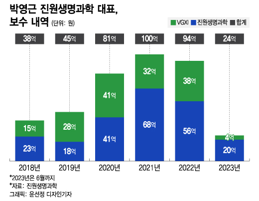 박 대표는 2021~2022년 진원생명과학과 자회사 VGXI로부터 연간 100억원에 육박하는 보수를 받았다. 진원생명과학에서 2018년 23억원, 2019년 18억원, 2020년 41억원, 2021년 68억원, 2022년 56억원, 올 1~6월 20억원의 급여를 받았다. VGXI까지 합산하면 박 대표 보수는 2018년 38억원, 2019년 45억원, 2020년 81억원, 2021년 100억원, 2022년 94억원, 올 1~6월 24억원으로 늘어난다. 진원생명과학이 2004년부터 작년까지 영업적자를 내고, 올해도 영업적자 가능성이 큰 상황이란 점에서 주주들의 원성을 샀다.