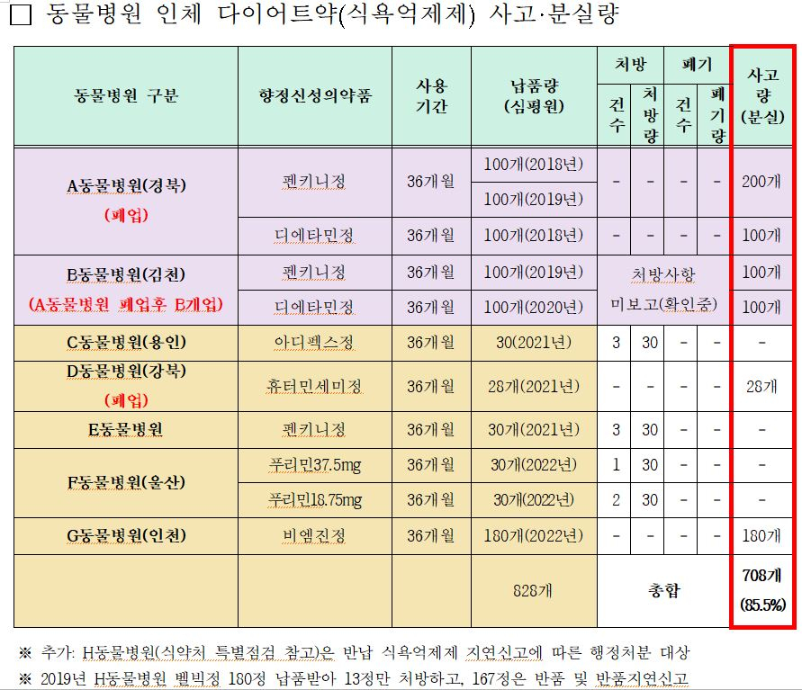 해당 마약성 식욕억제제를 납품받은 7곳의 동물병원 중 4곳은 사용기간이 임박·경과했음에도 불구하고 이를 처방하지 않았다. 또한 폐업한 동물병원에서 보유하던 마약류가 모두 사라지는 사고도 발생했다.