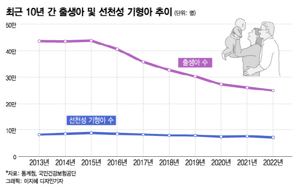 온라인 커뮤니티를 중심으로 늦은 결혼과 임신 등을 이유로 선천성 기형아 비율이 급증해 5명 중 1명에 달한다는 '괴담'이 확산하는 가운데 실제 선천성 기형아 비율은 이보다 더 높은 것으로 확인됐다. 연간 선천성 기형으로 진단을 받은 절대 숫자는 감소하고 있지만 전체 출생자가 더 가파르게 감소하면서 비율이 높아진 것으로 해석된다.