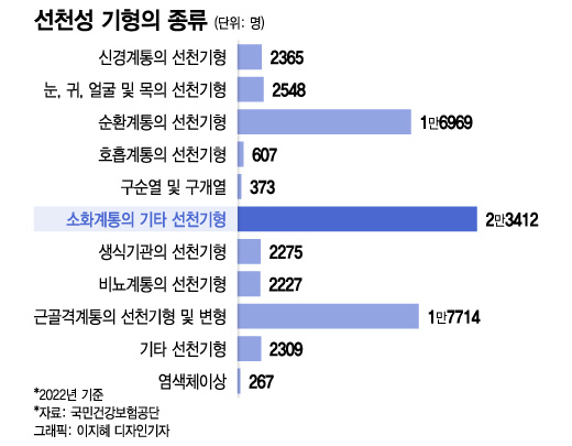 선천성 기형아는 줄고 있지만 출생아가 더 빠르게 감소하면서 전체 출생아 중 선천성 기형아의 비율은 되레 증가했다. 2013년 출생아 대비 선천성 기형아 비율은 18.7%였지만 지난해는 28.5%로 출생아 4명 중 1명 이상이 선천성 기형을 진단받은 것으로 파악됐다. 지난해를 기준으로 질병분류 상 소화계통의 기타 선천기형이 2만3412명으로 가장 많았고 근골격계통의 선천기형 및 변형(1만7714명)과 순환계통의 선천기형(1만6969명)도 각각 1만명 이상이었다. 눈과 귀 등 얼굴 쪽 기형과 생식기, 비뇨 계통 기형아도 2000명대를 기록했다.
