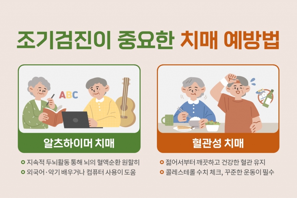 치매를 예방하려면 생활 습관 개선이 무엇보다도 중요하다. 발생 빈도가 가장 높은 알츠하이머 치매는 외국어나 악기 연주, 컴퓨터 사용 등 두뇌활동을 지속해 뇌의 혈액순환을 원활히 유지하는 것이 발병을 지연하는 데 효과적이라고 알려져 있다. 혈관성 치매를 막으려면 젊어서부터 깨끗하고 건강한 혈관을 유지하는 것이 필수다. 박 센터장은 "40대부터는 혈압, 혈당, 콜레스테롤 수치를 자주 확인하고 위험인자를 가진 경우 뇌혈관 상태를 정기적으로 점검하는 것이 좋다"며 "매일 30분에서 1시간 규칙적으로 운동을 하는 것도 뇌세포의 산화 손상을 감소시키고 뇌 조직을 보호해 치매를 예방하는 데 도움이 된다"고 조언했다.